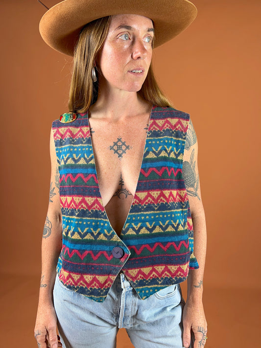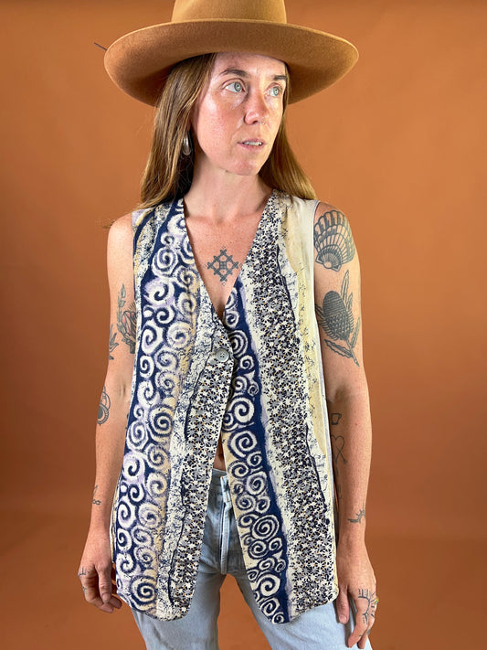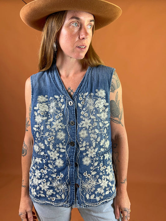 VINTAGE 80's Denim Floral Embroidered Vest 14