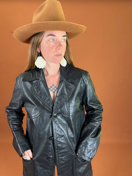 VINTAGE 60's Big Collared Black Leather Jacket 10-12