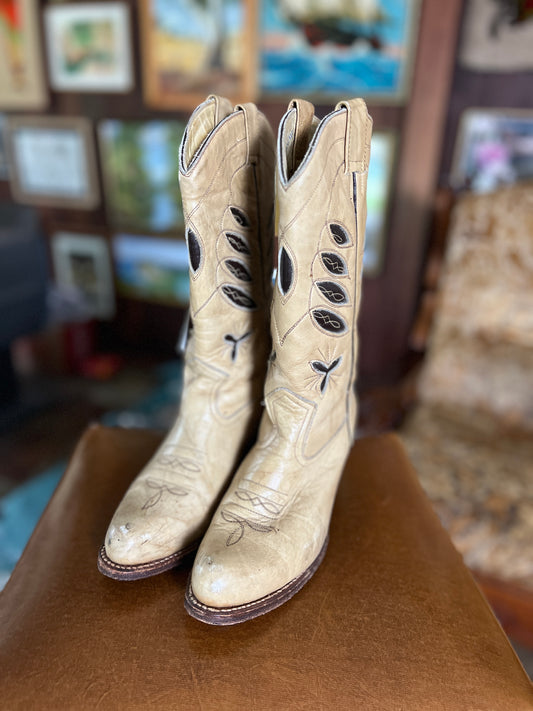 VINTAGE 70's Cream Cut Out Mexican Cowboy Boots 6.5/37