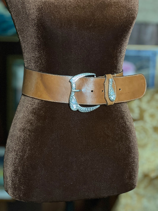 VTG 80’s Big Buckle Tan Leather Belt 14-16