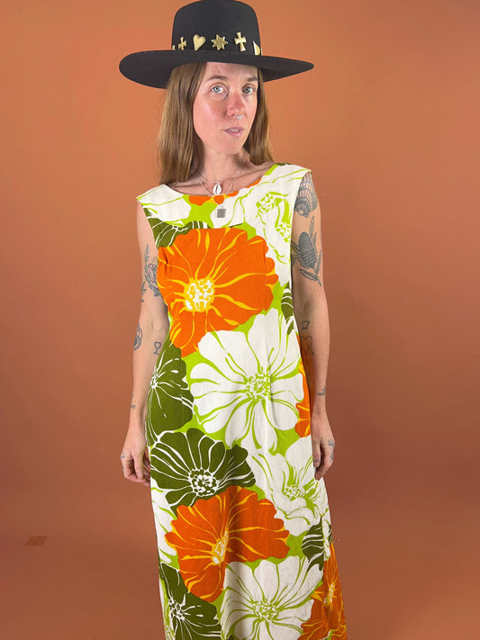 VTG 60’s Cotton Floral Back Pleat Maxi 10-12