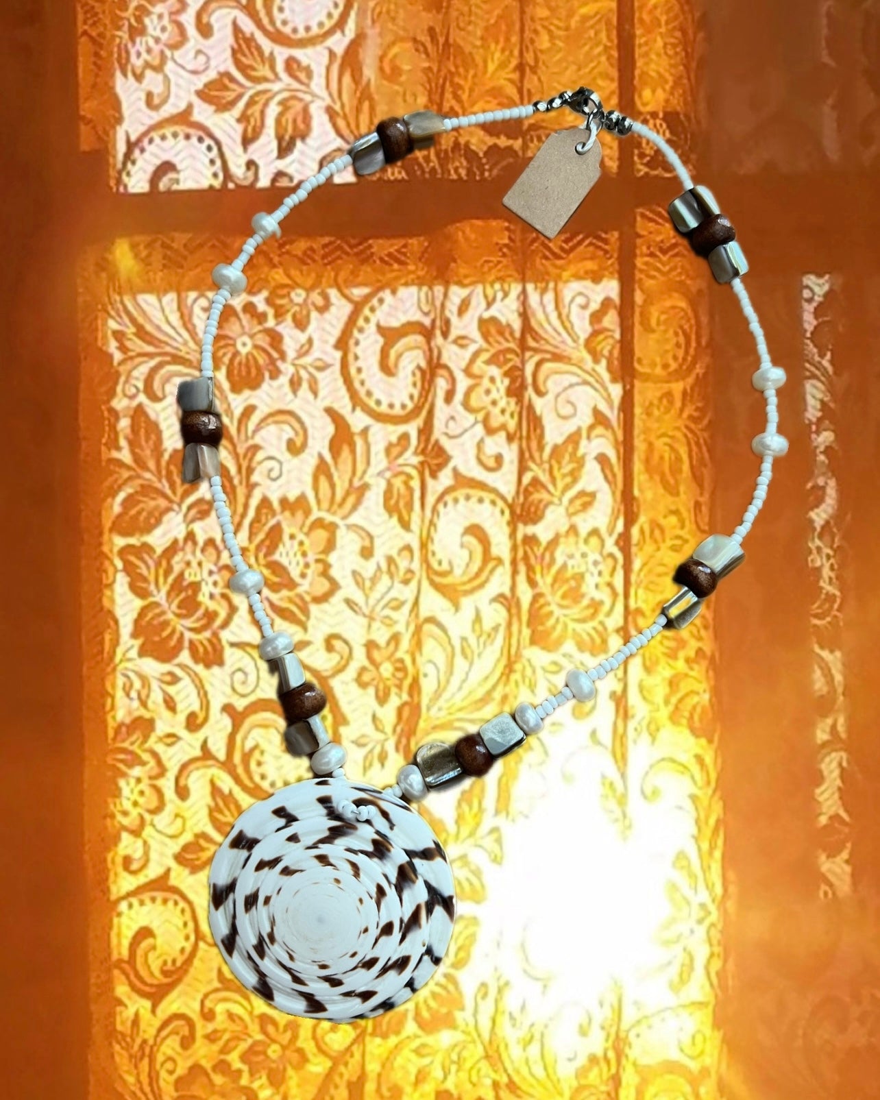 BEADED SUNRAYS Cone Shell, Pearl, Shell Pendant Necklace 18”