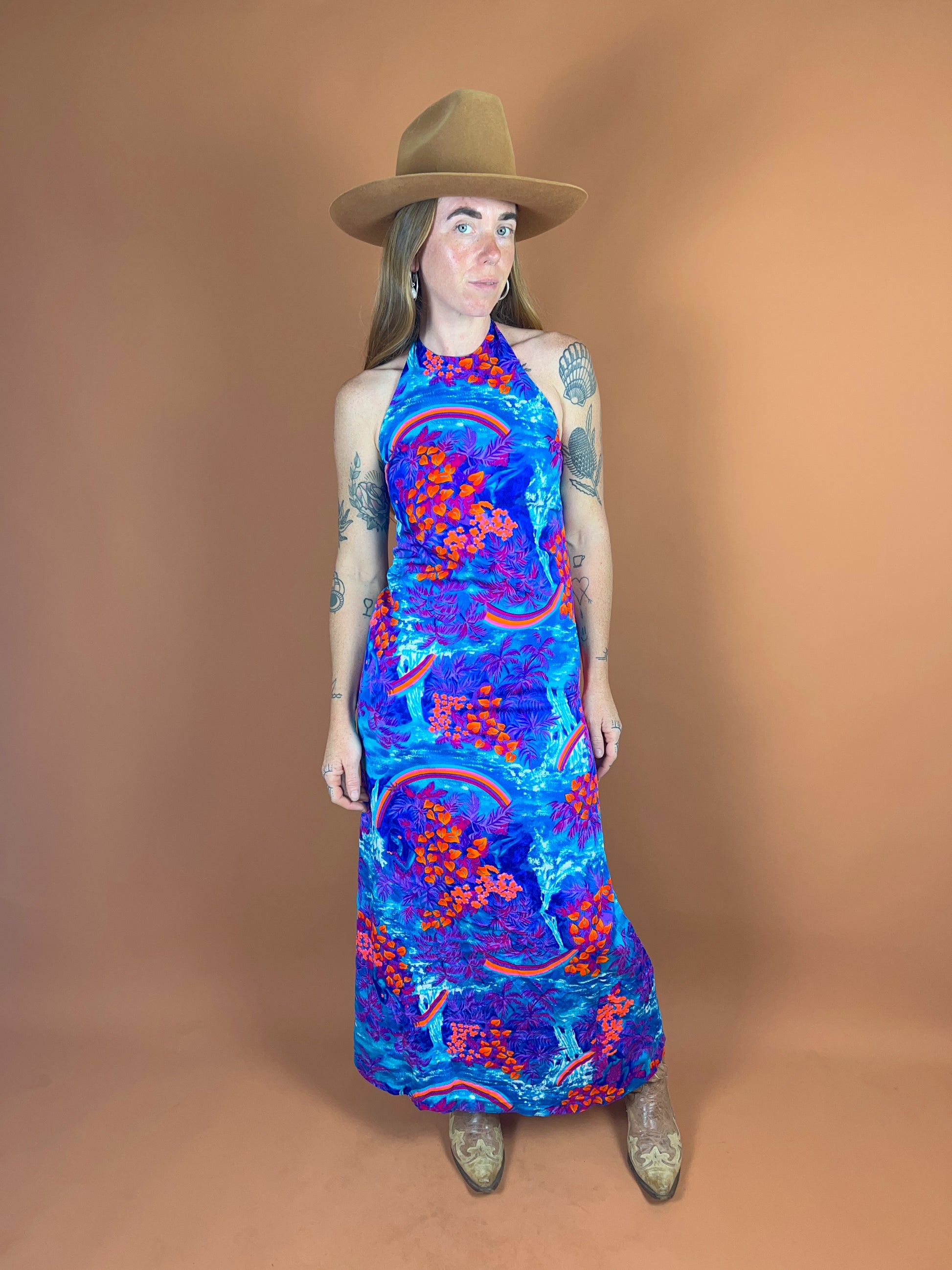 VINTAGE 60’s/70’s Floral Cotton Halter Maxi Dress 6-8