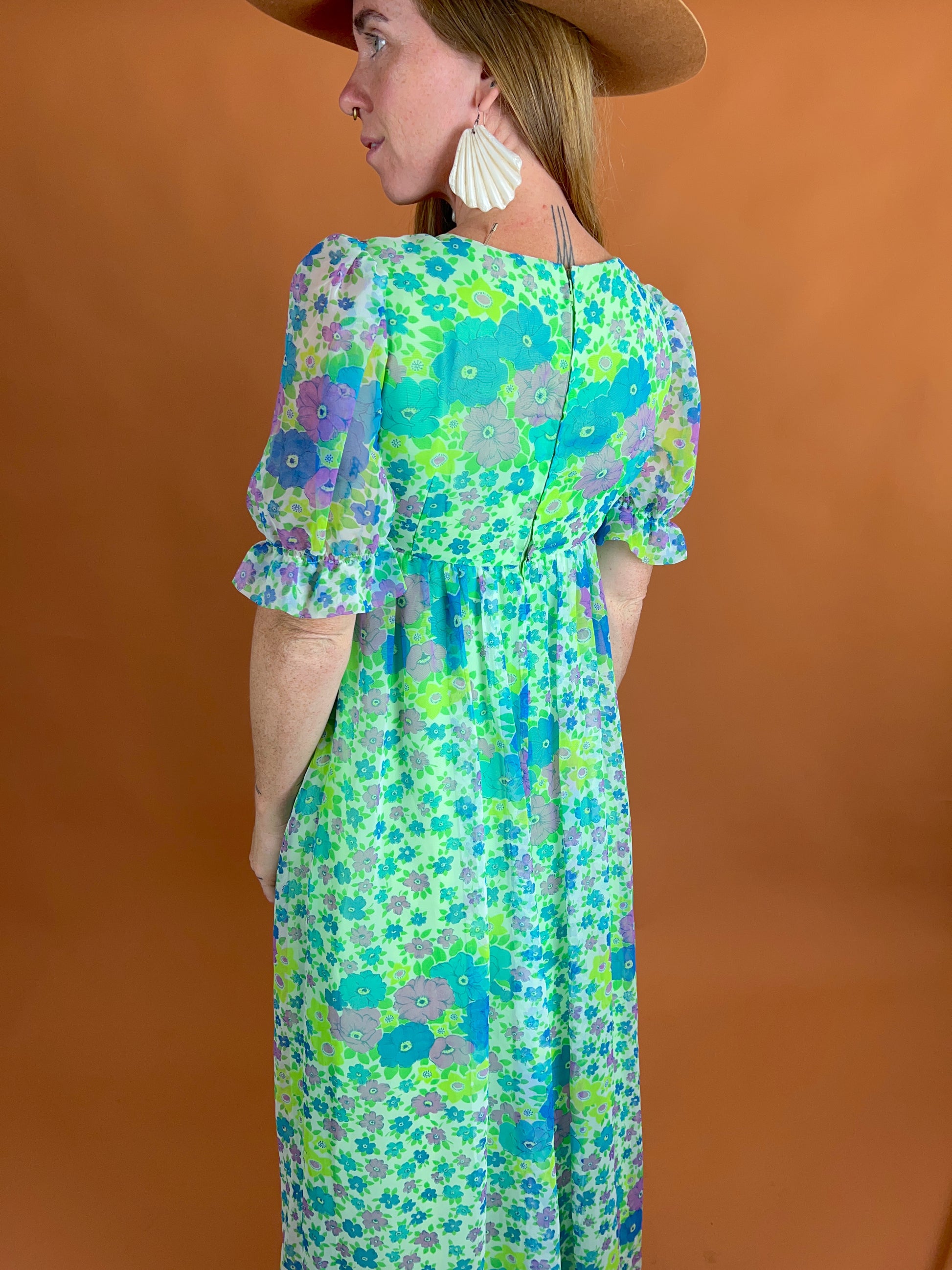 Discover timeless elegance in this enchanting vintage 60s floral maxi dress. Blooming florals in soft, romantic hues dance across flowing fabric, embodying the optimistic spirit of the decade. Layer it with a vintage denim jacket, pair with delicate sandals, or accessorise with retro jewellery for versatile styling. A timeless treasure that brings romantic, free-spirited energy and nostalgic charm to your collection. Back zip closure.