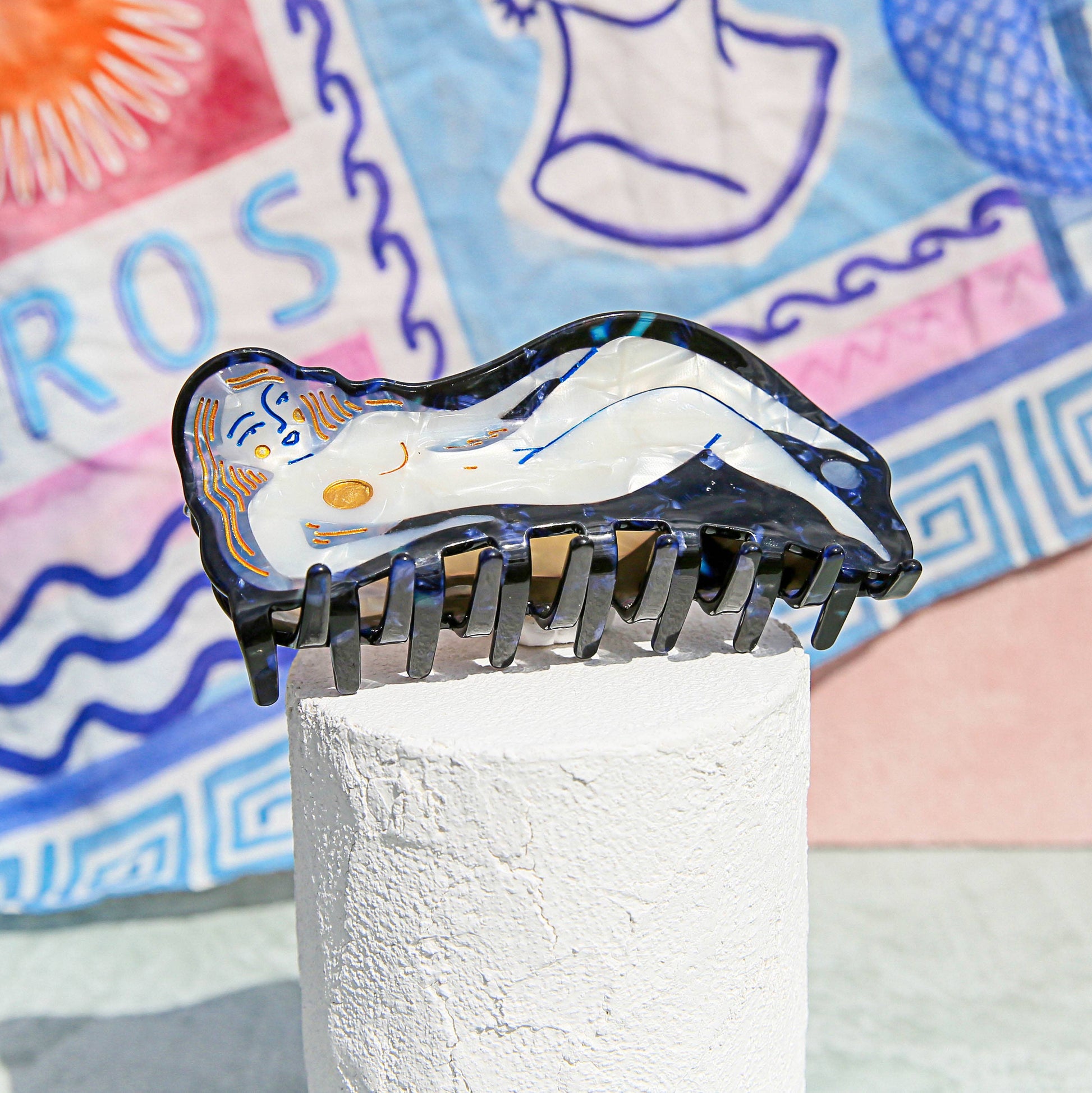 Designed by Jemima Kingston in her Australian studio, each hair claw and clip blends plant-based biodegradable acetate with traditional acetate, accented by pearls, paint, and metal details. This blue-engraved piece measures 12.5cm wide and 5.5cm high, embodying a unique bohemian charm.