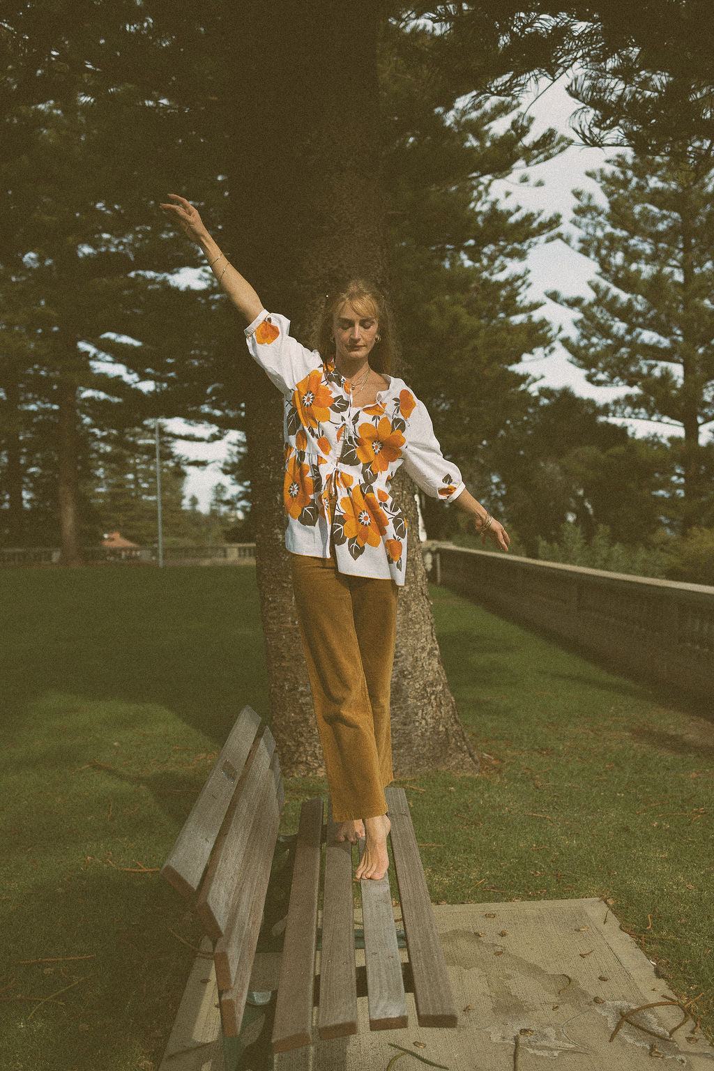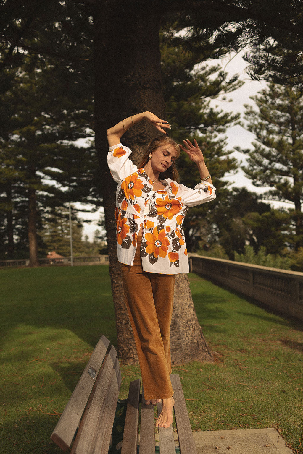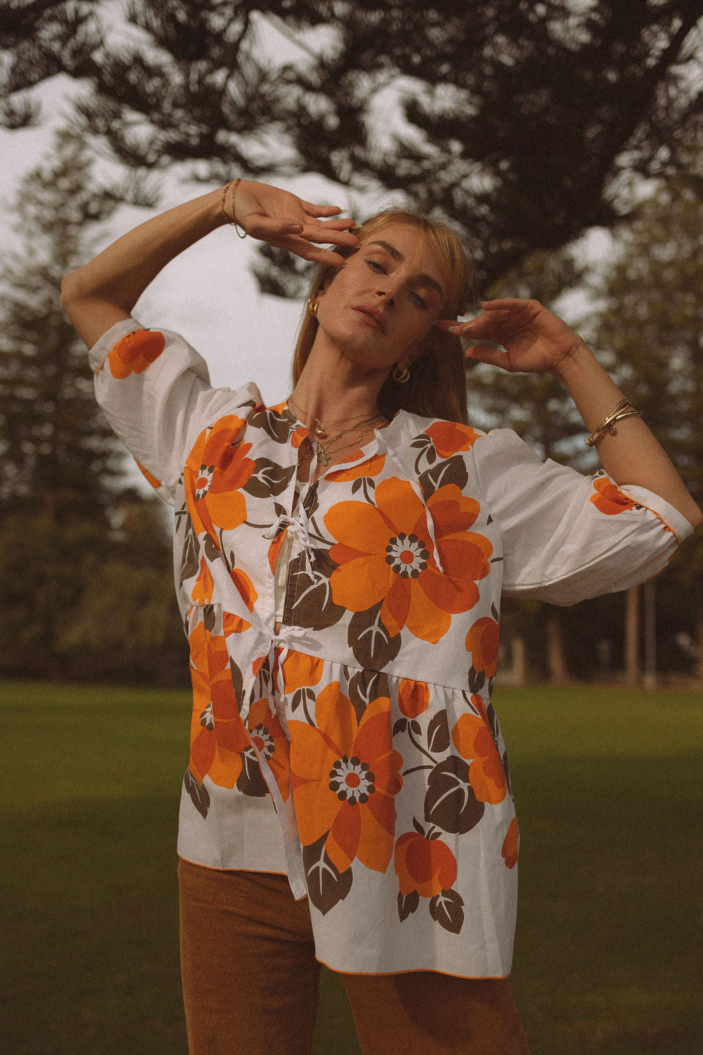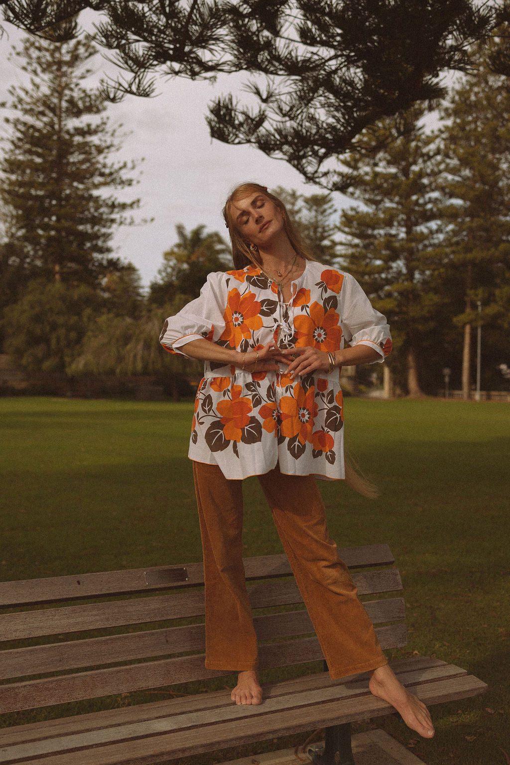 The SECOND SHINE SLOW FASHION Vintage Up-cycle Cotton Sheet Tie Front Blouse in size 14-16 blends bohemian ease with sustainable style. Made from repurposed vintage cotton sheets, this blouse features a relaxed fit and a charming tie-front detail, perfect for adding a unique, eco-friendly touch to your wardrobe.