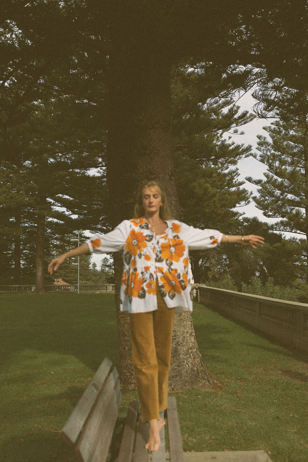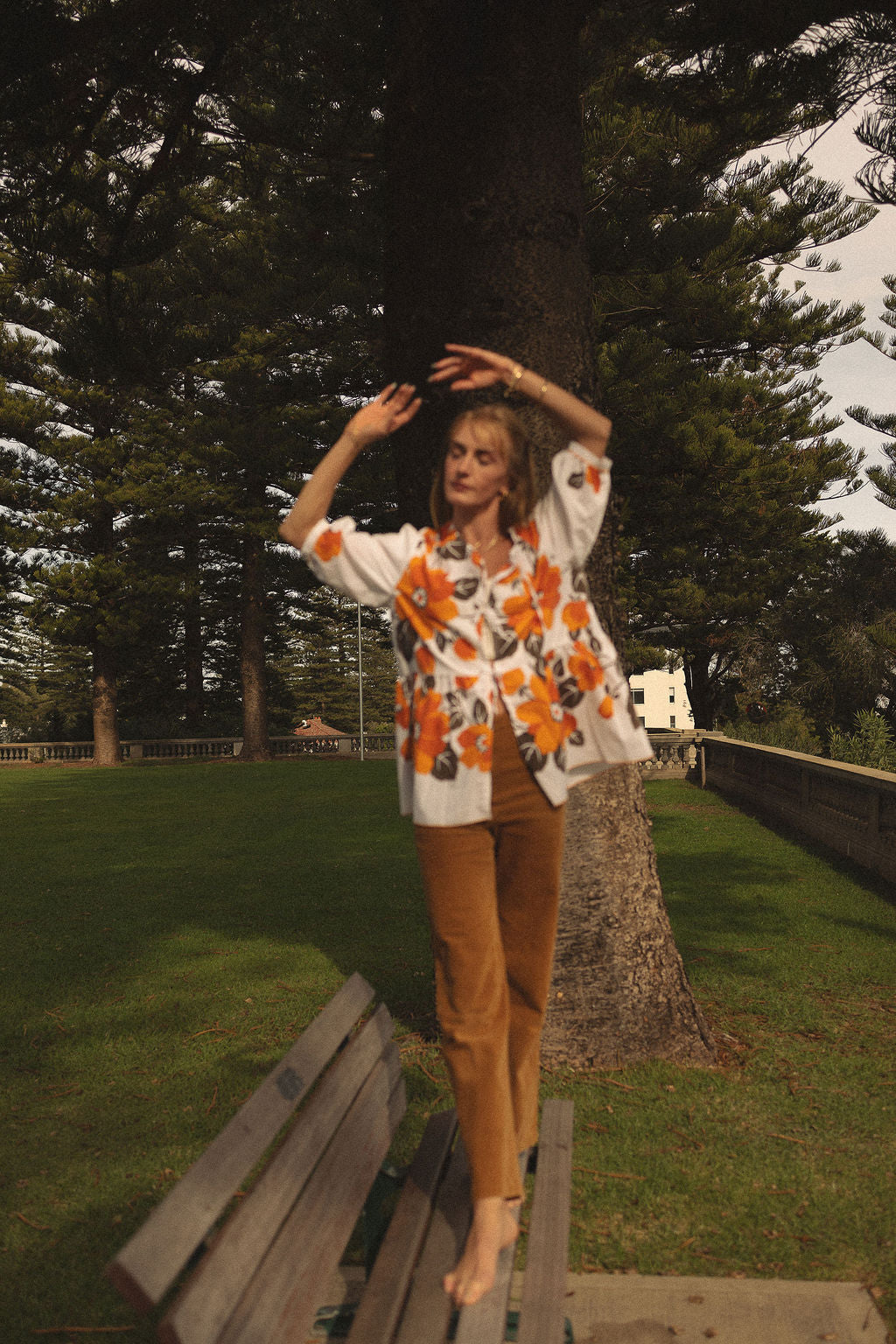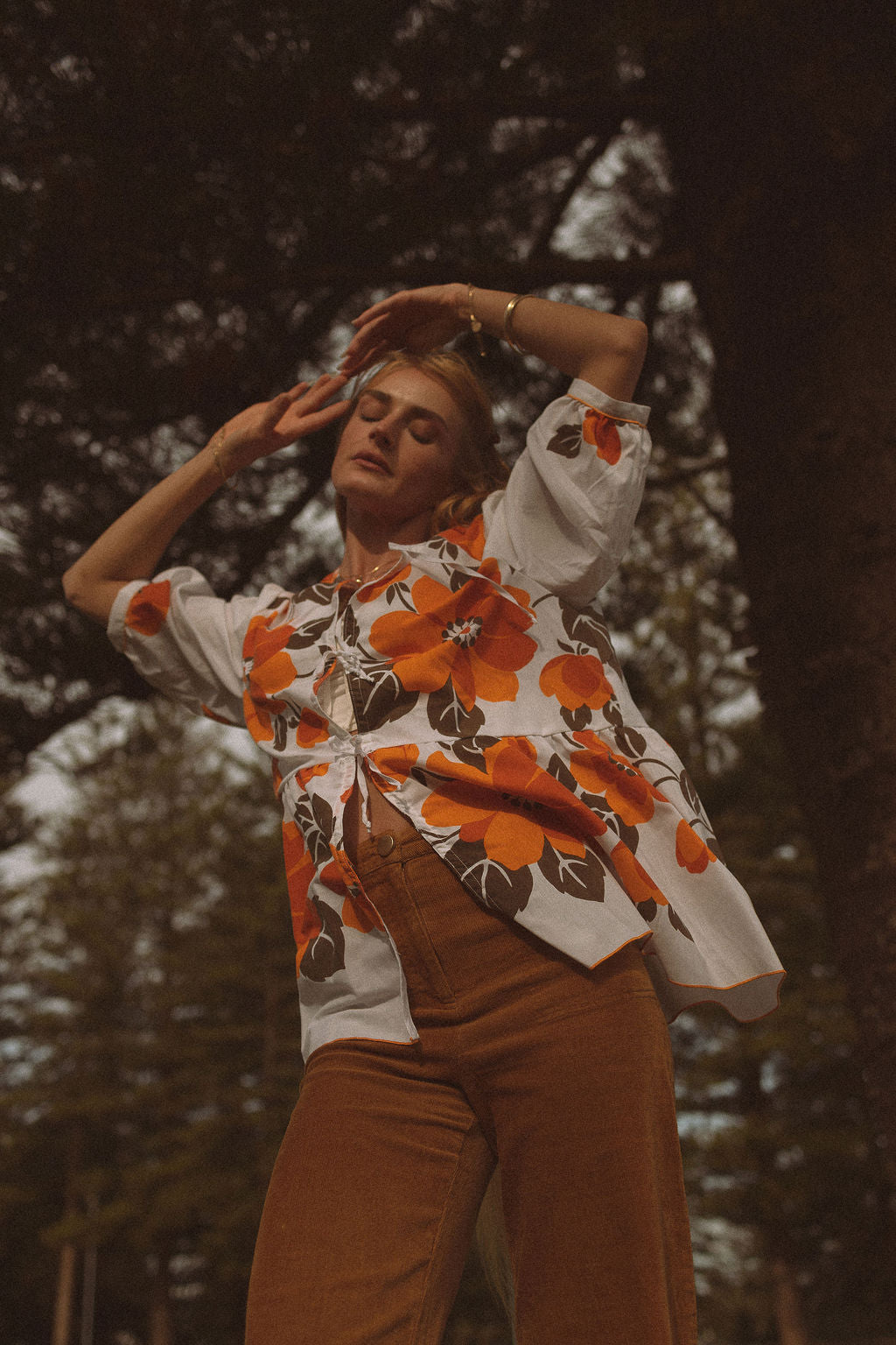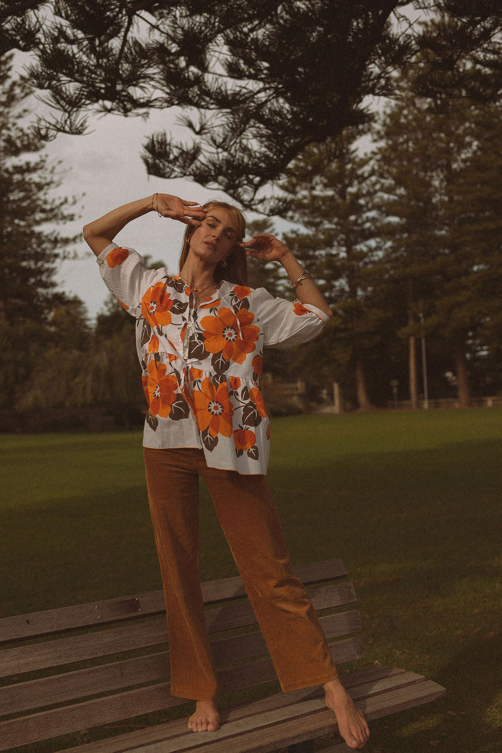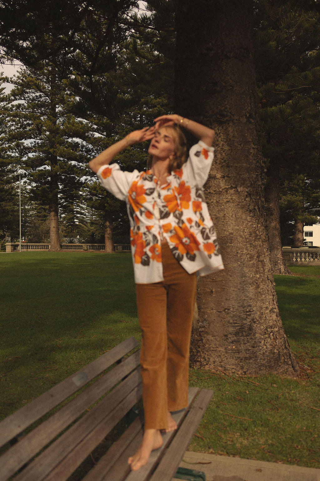 The SECOND SHINE SLOW FASHION Vintage Up-cycle Cotton Sheet Tie Front Blouse in size 14-16 blends bohemian ease with sustainable style. Made from repurposed vintage cotton sheets, this blouse features a relaxed fit and a charming tie-front detail, perfect for adding a unique, eco-friendly touch to your wardrobe.