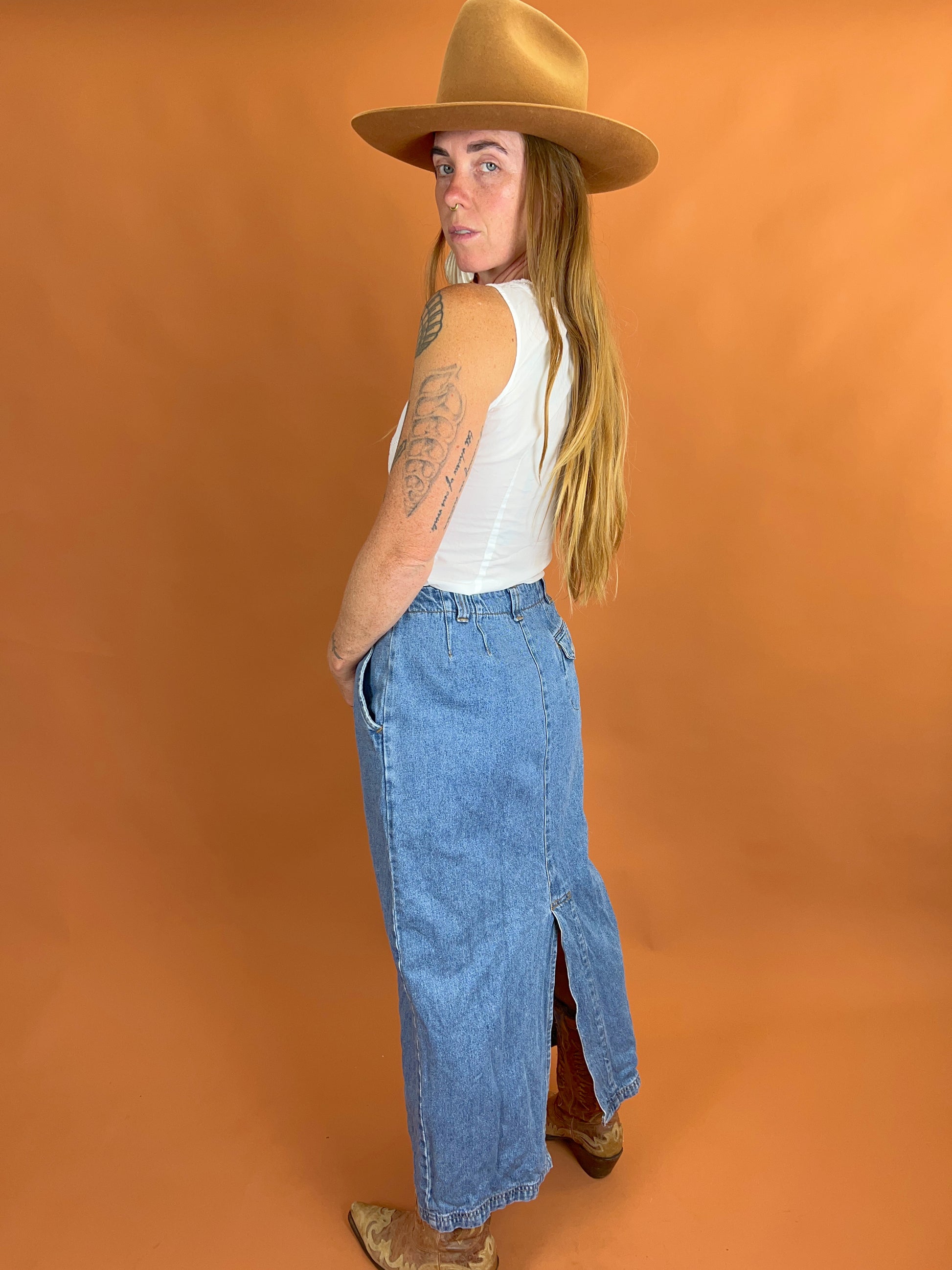 Channel 80's nostalgia with this vintage denim maxi skirt. Crafted from sturdy denim with a relaxed, floor-grazing length, it's a statement piece that effortlessly blends retro charm with bohemian ease. The classic wash and timeless silhouette work beautifully with everything from vintage band tees to flowing blouses. A wardrobe essential for those who celebrate individuality and sustainable style. Size 10. Sussan label. Wear on your waist for a size 10, or wear lower on a size 6-8.