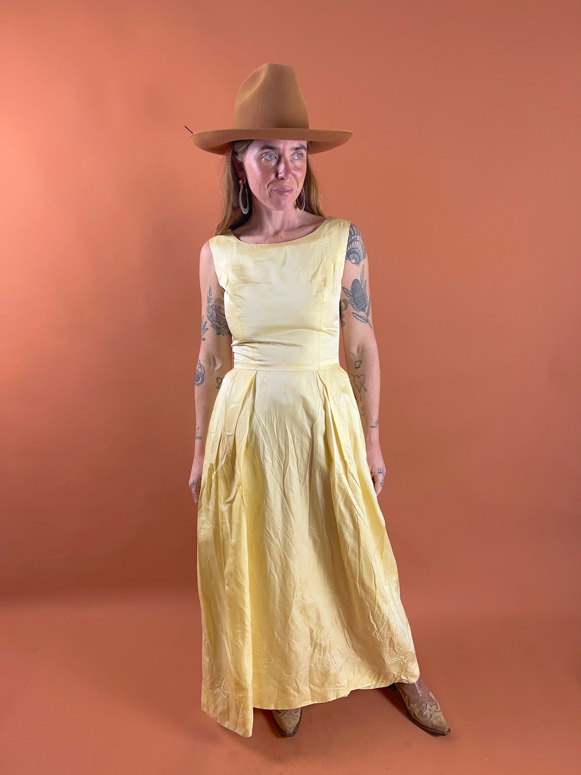 Embrace radiant bohemian elegance with this vintage 60's banana yellow silk maxi dress, tailored for size 8. Its smooth silk fabric offers a luxurious, flowing fit that moves effortlessly with you. The vibrant hue and classic maxi length create a standout piece perfect for warm days or special gatherings infused with a free-spirited vintage charm. Pair with a chunky belt and cowboy boots for the ultimate cowboy luxe outfit. Back zip closure.