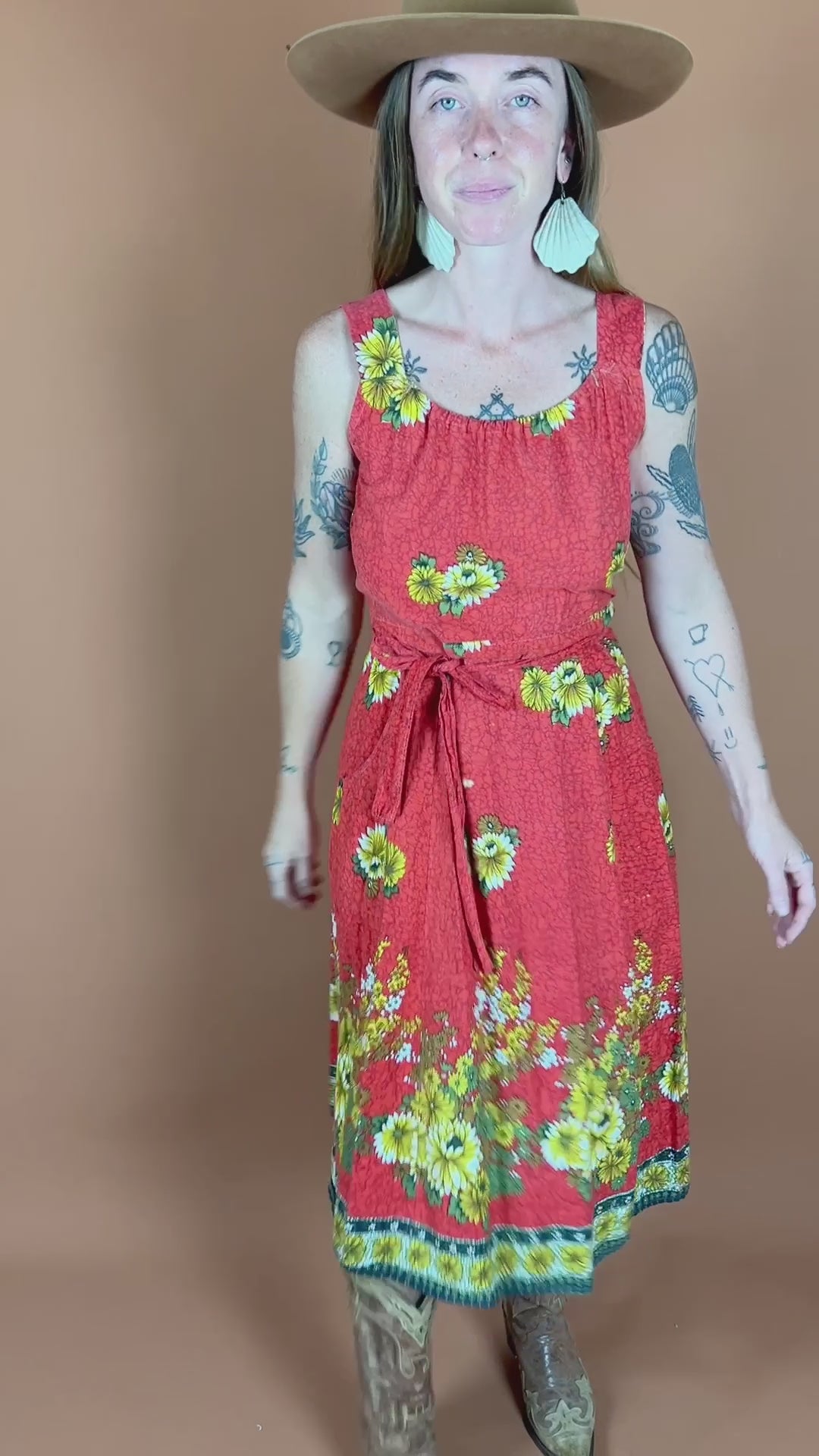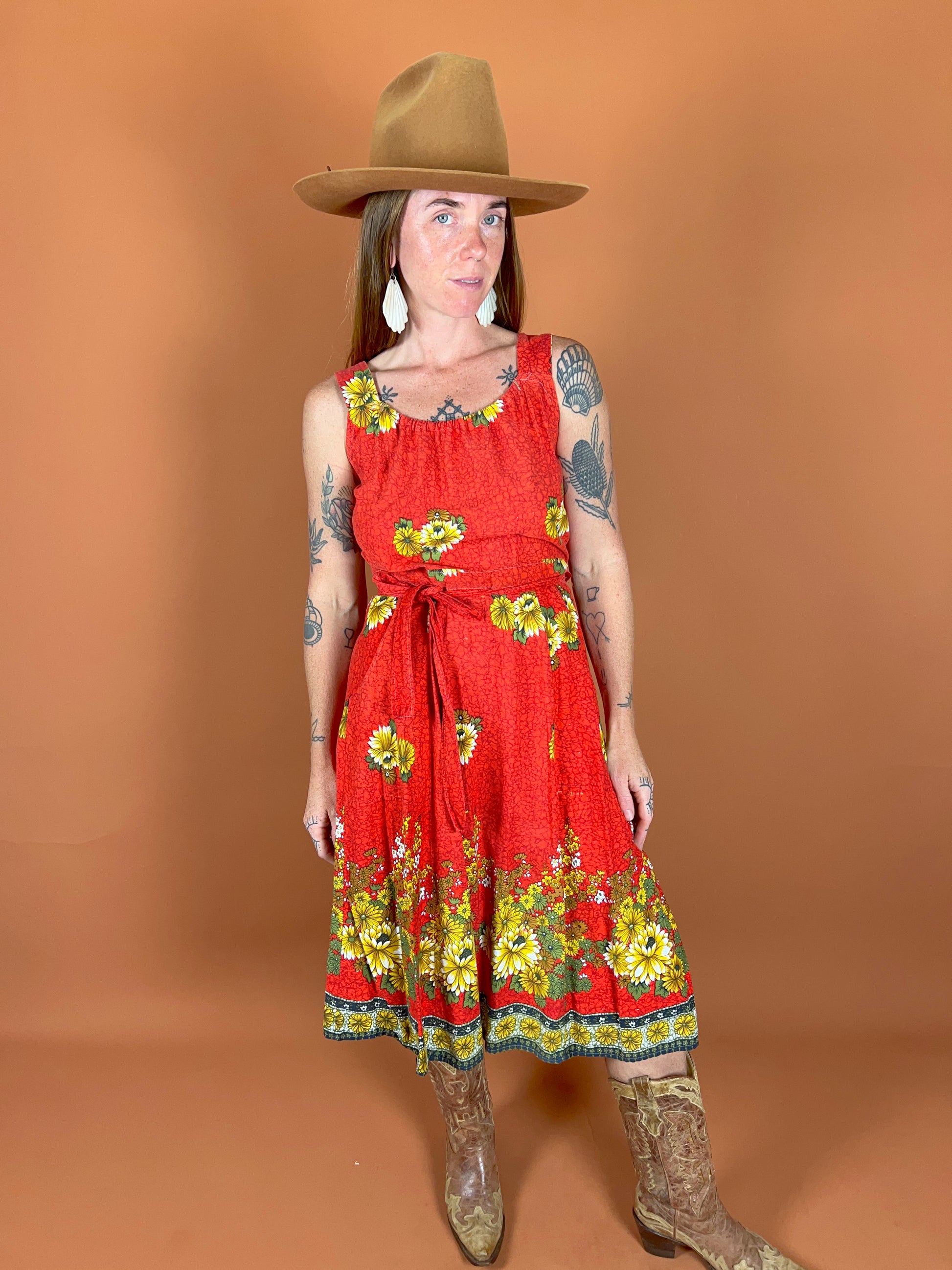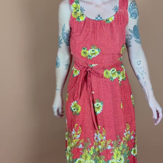 Vintage 70's red floral cotton wrap dress with elastic neckline.