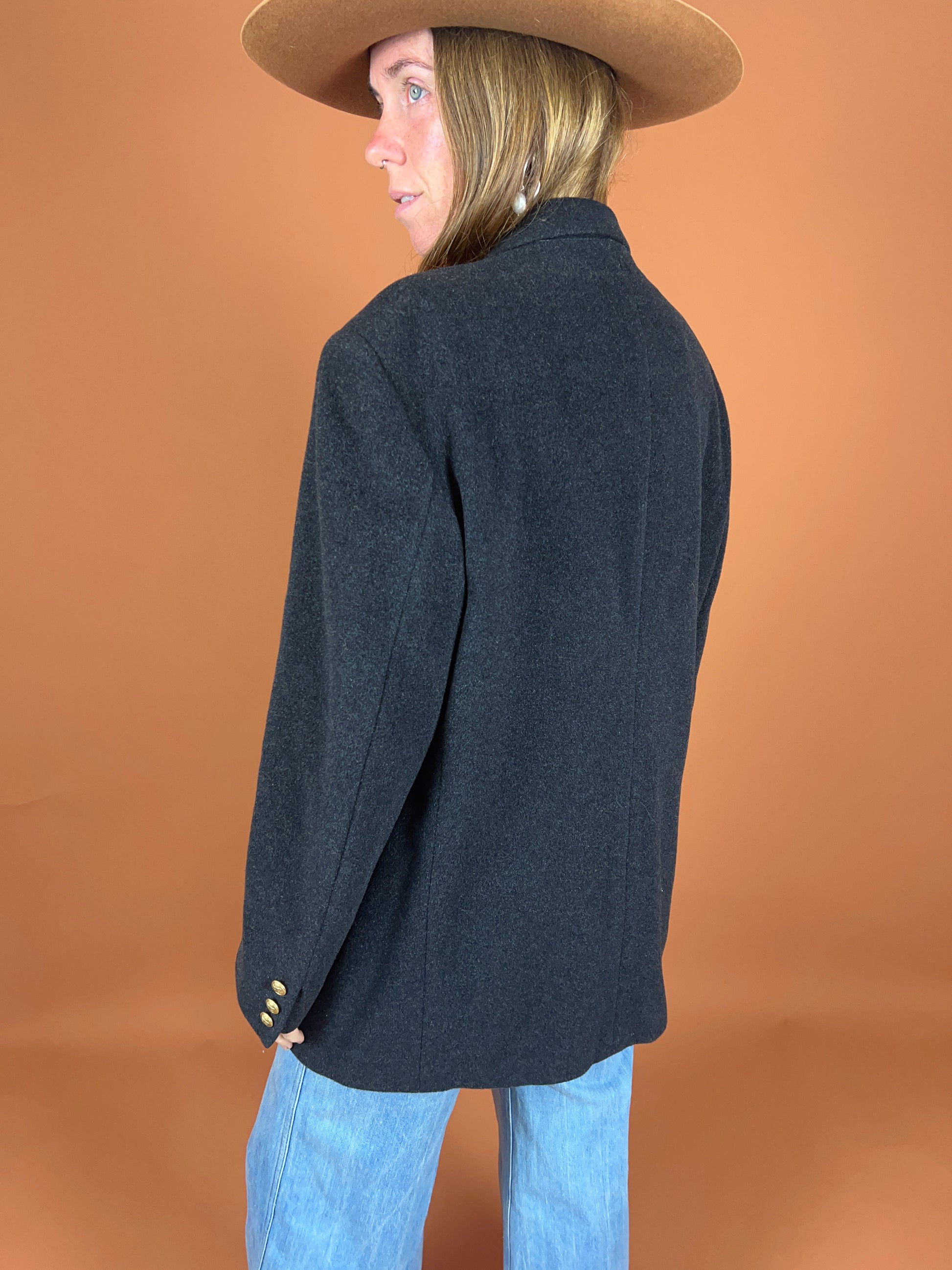 80s Fletcher Jones wool cashmere blazer with gold buttons.