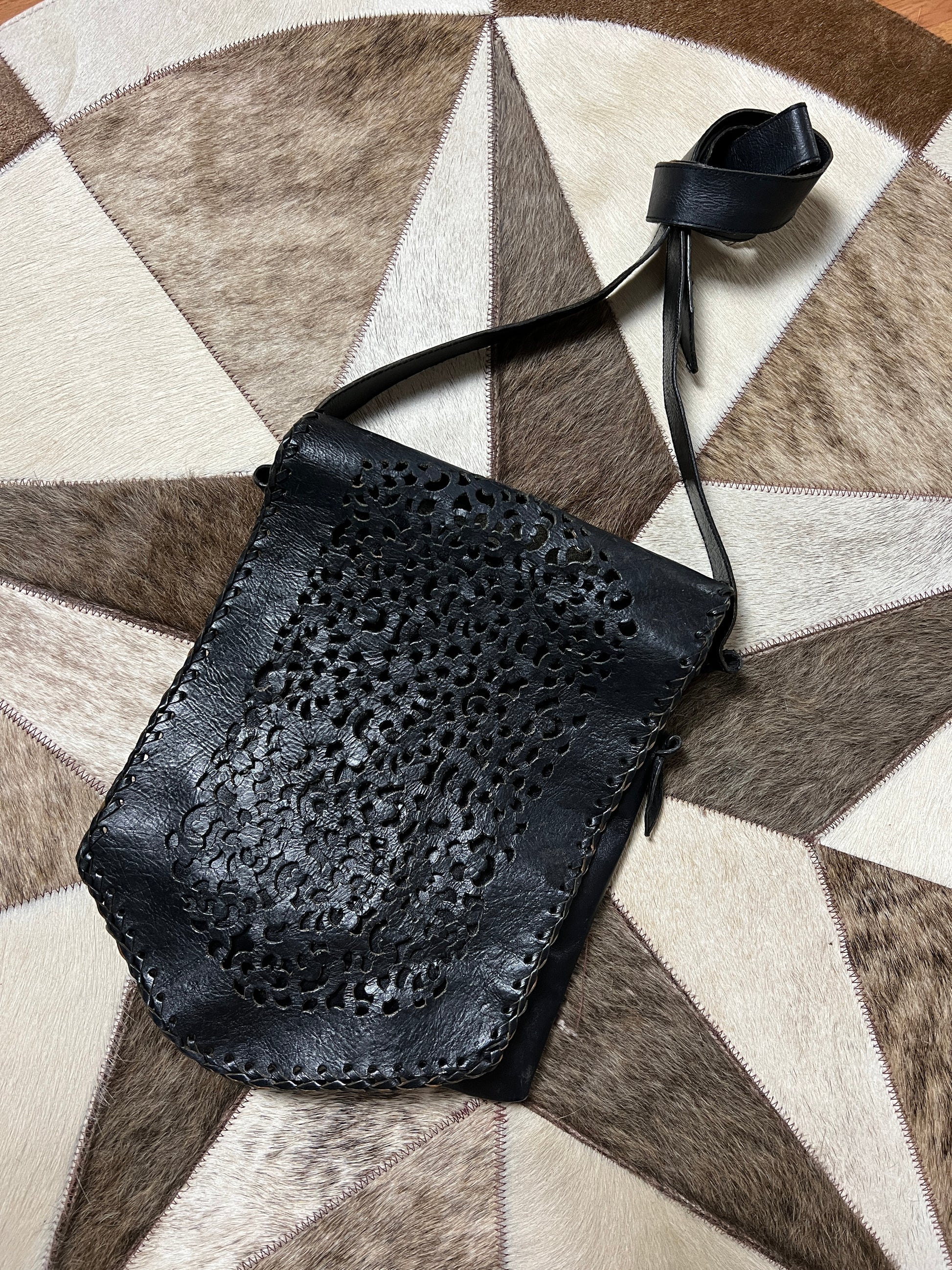Carry a piece of the 90's with this vintage black leather satchel bag, featuring unique cut-out details that radiate bohemian elegance. Its spacious design combines practicality with artistic flair, perfect for those who value style and function. Crafted for the free-spirited, this bag adds effortless cool and character to your everyday look. Leather.