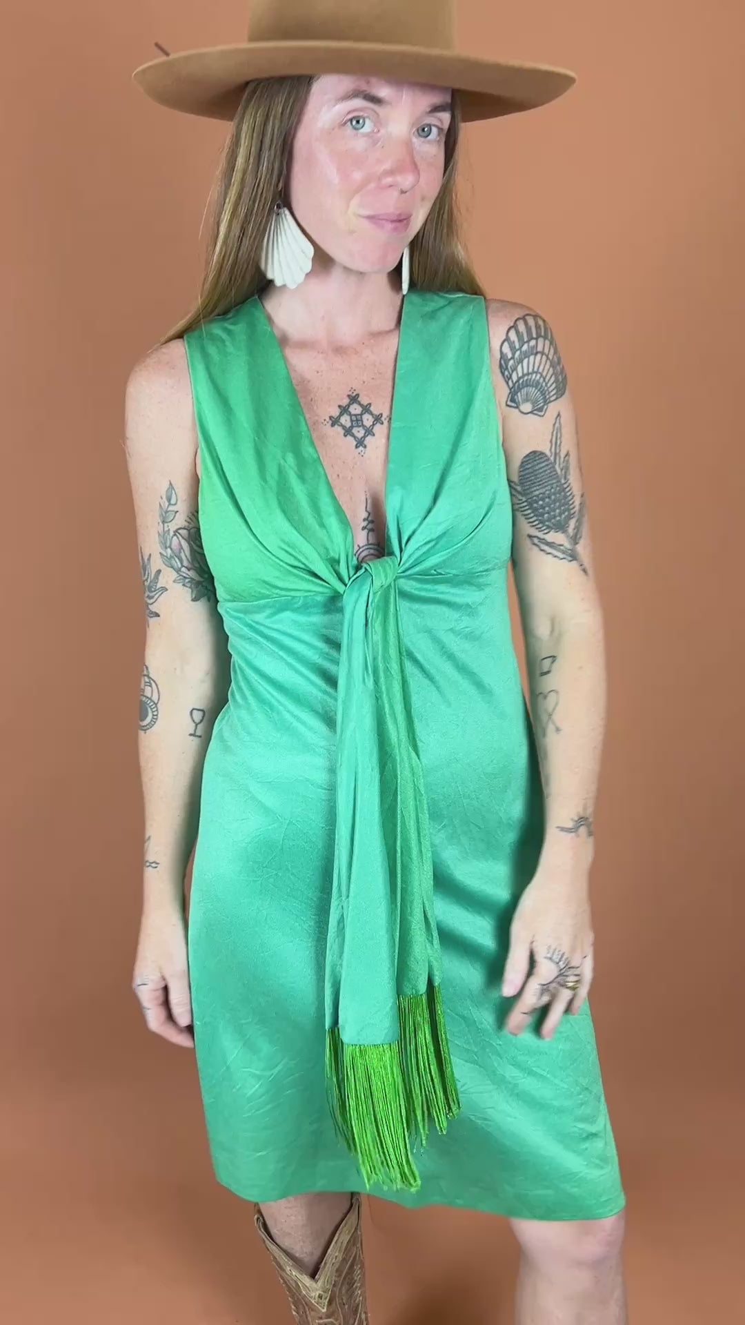 Vintage 60s green mini dress with front tie tassel.