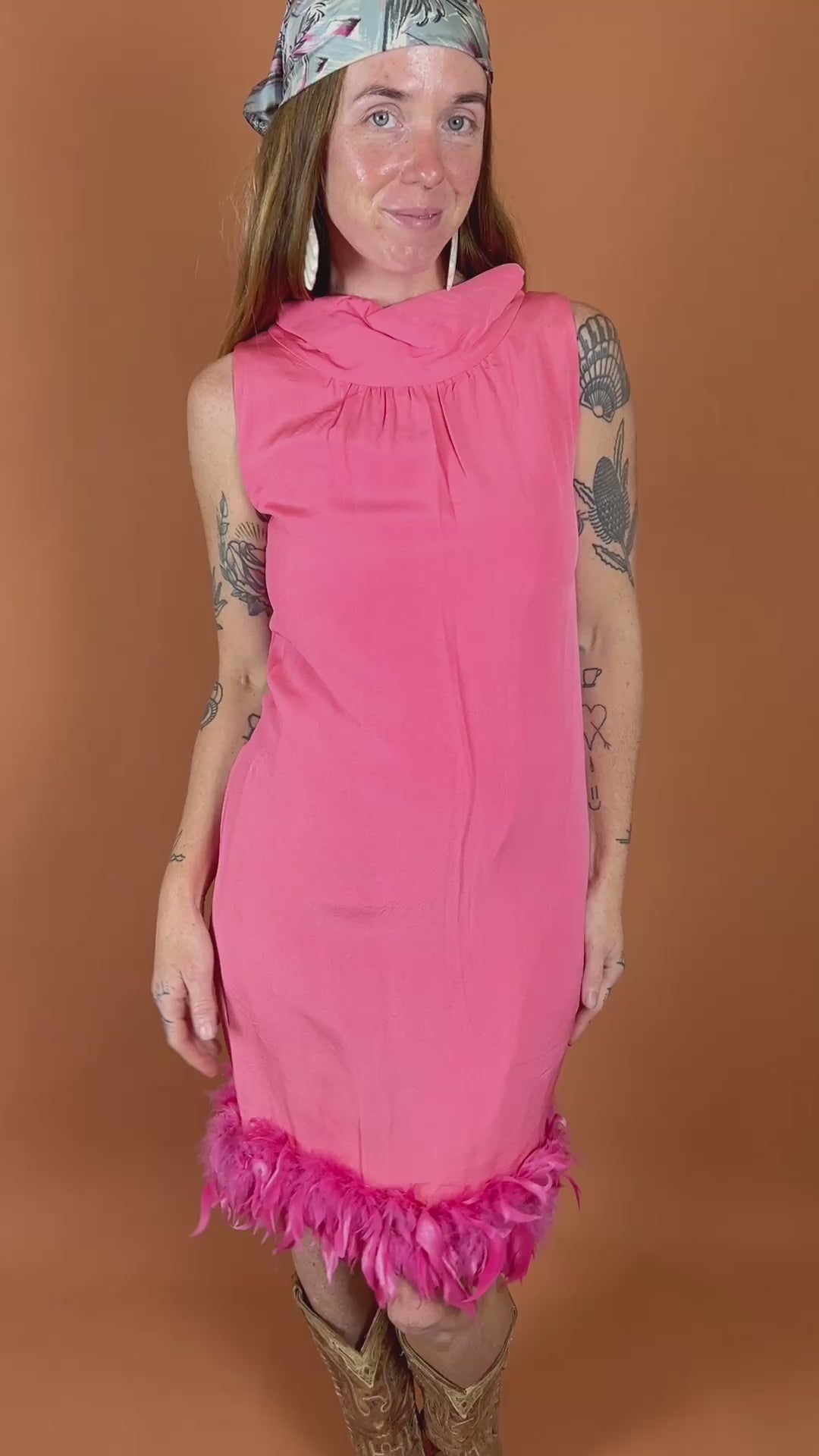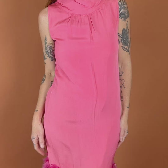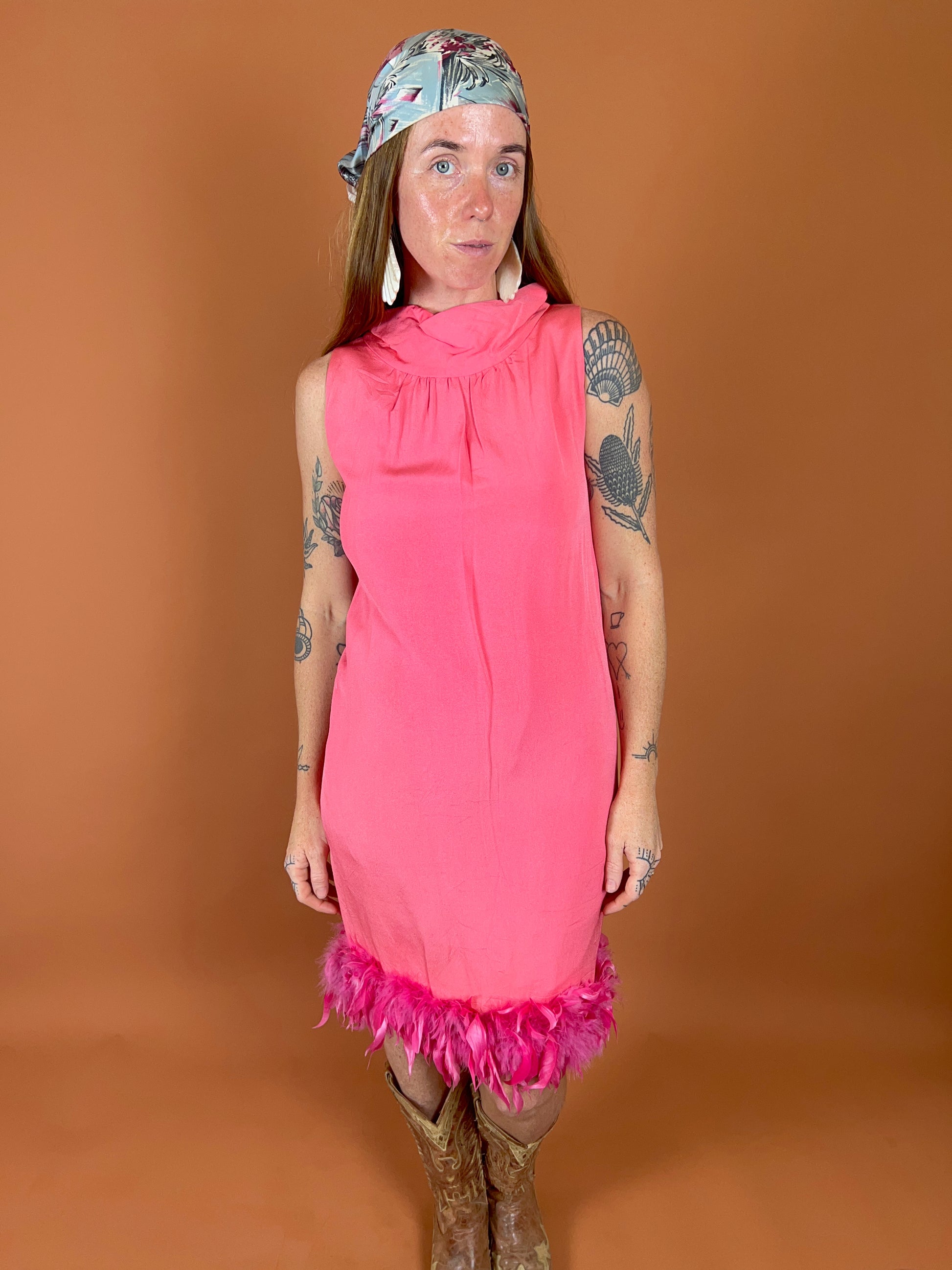 Vintage 60s silk and feather mini dress. Back zip closure.
