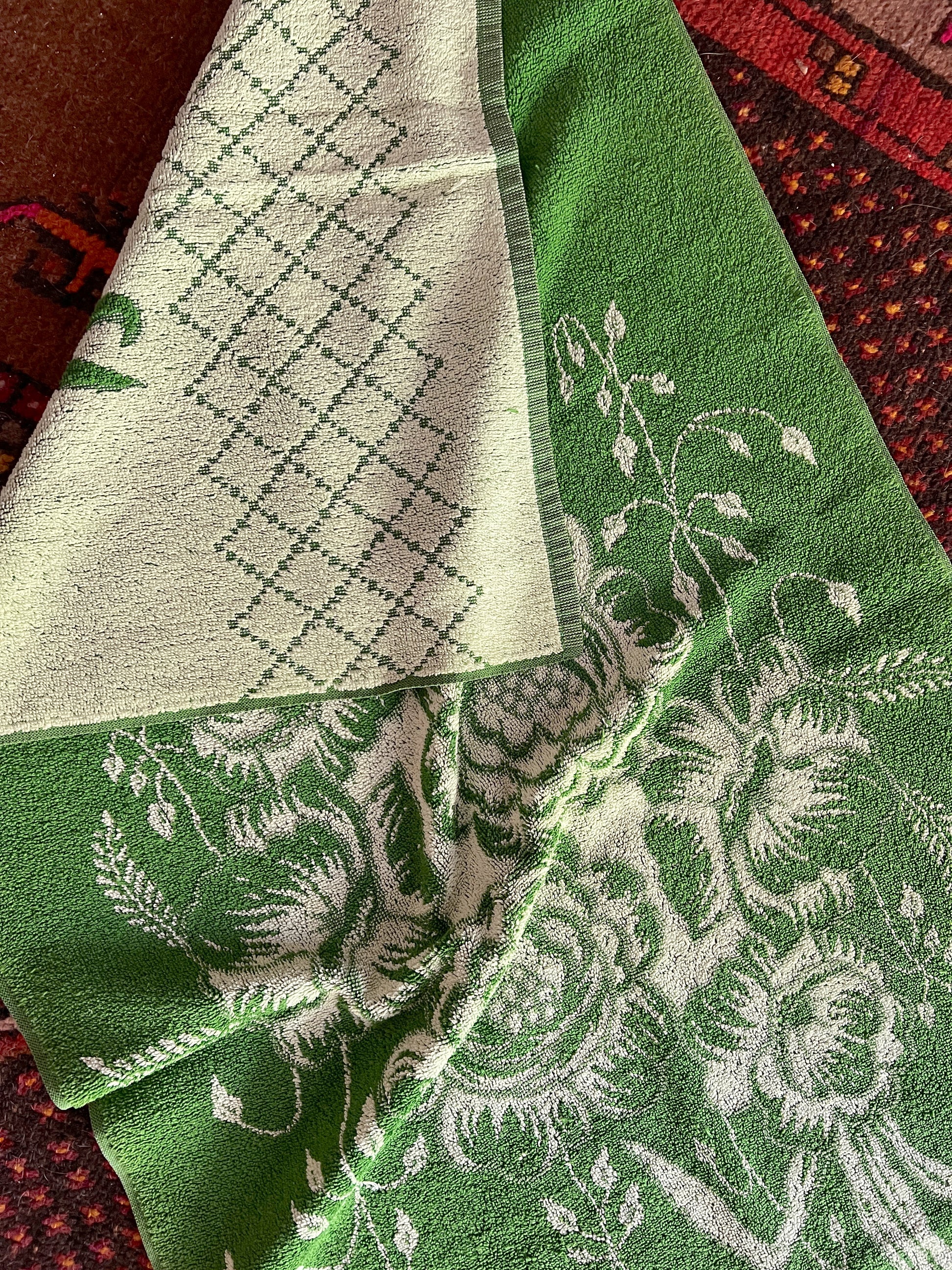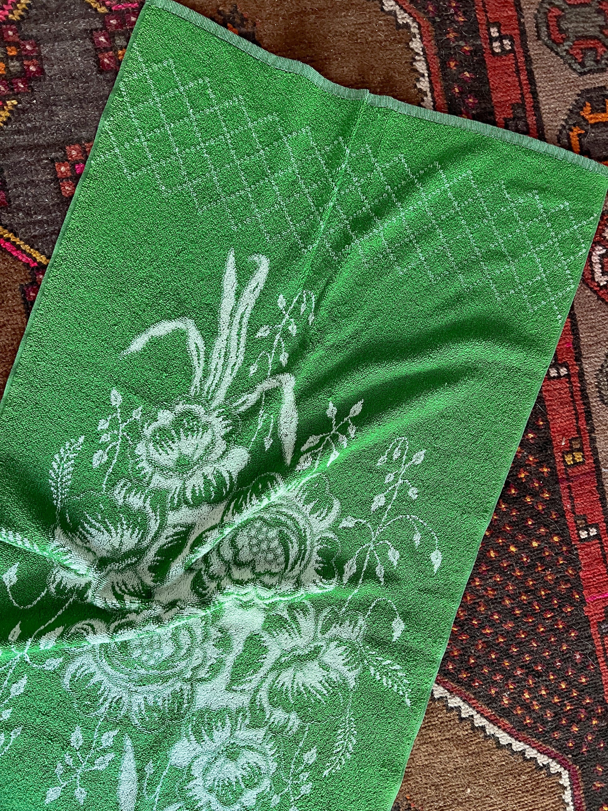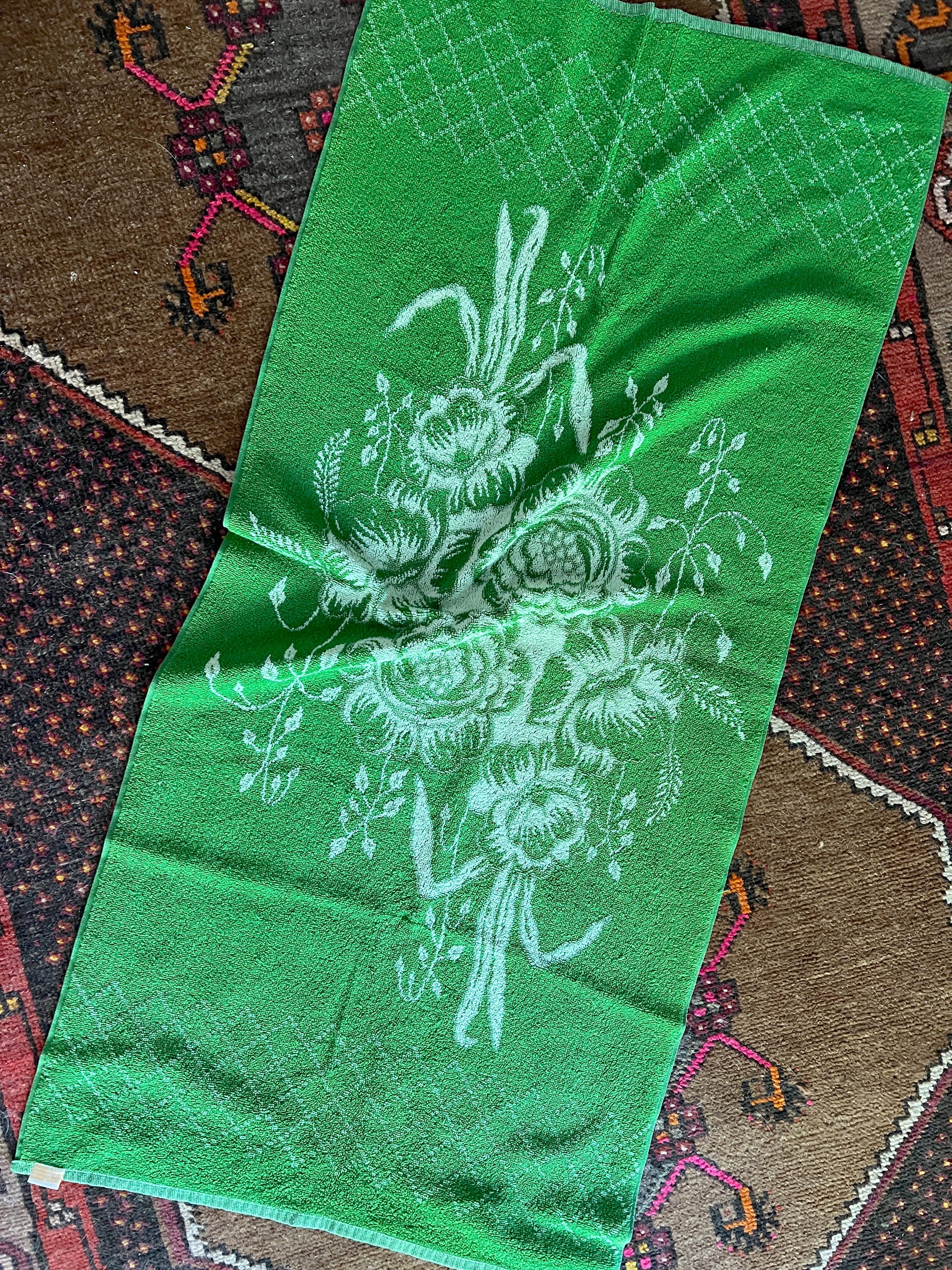 Step back in time with this charming vintage 60s green floral towel. Featuring a delicate botanical print that captures the essence of retro style, this piece brings warmth and character to any bathroom or bedroom. Soft and absorbent, it's perfect for adding a touch of groovy nostalgia to your daily routine. A true treasure for vintage lovers and anyone seeking authentic mid-century home décor.