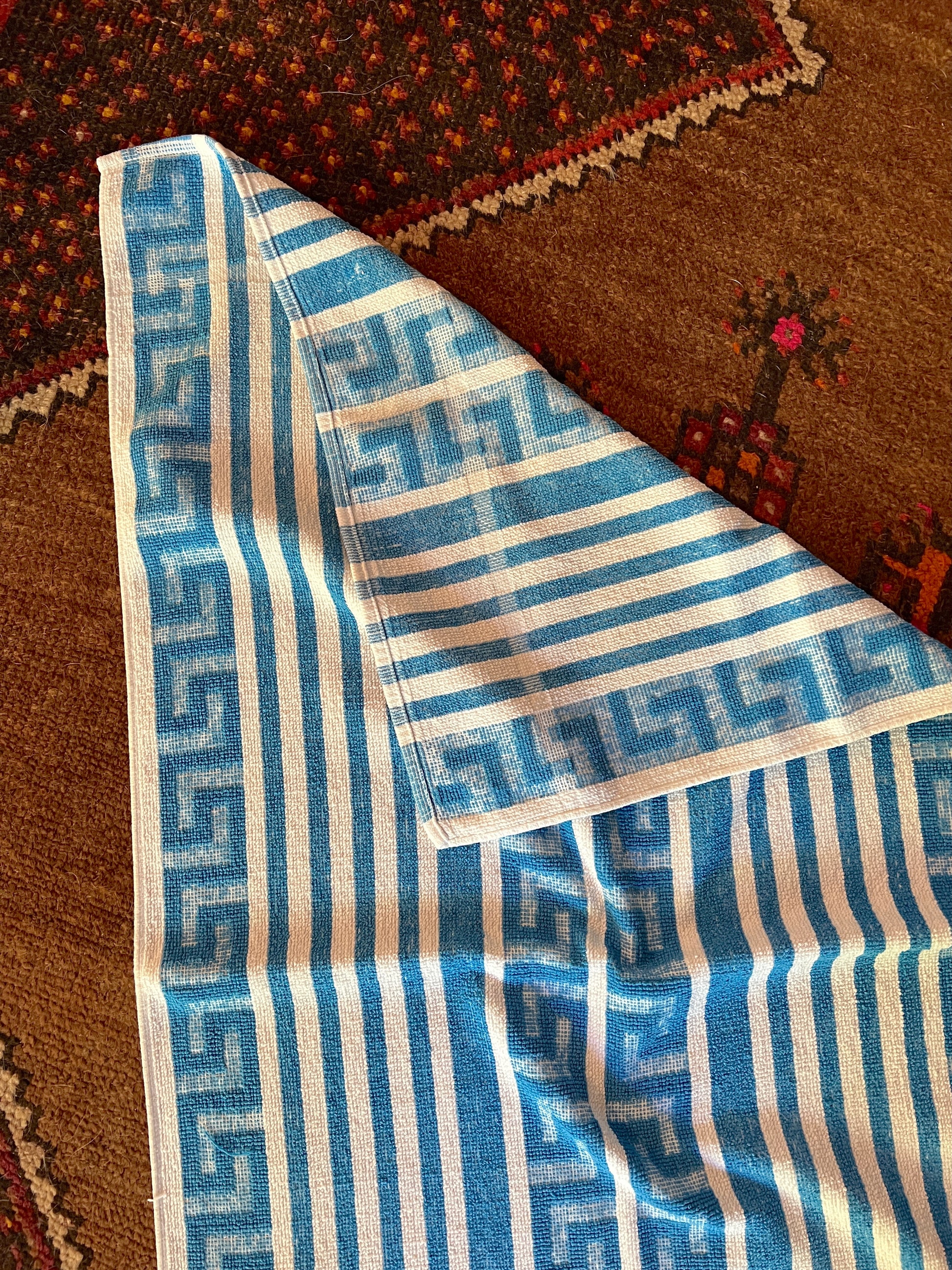 Vintage 70s blue and white stripe towel with pattern border.