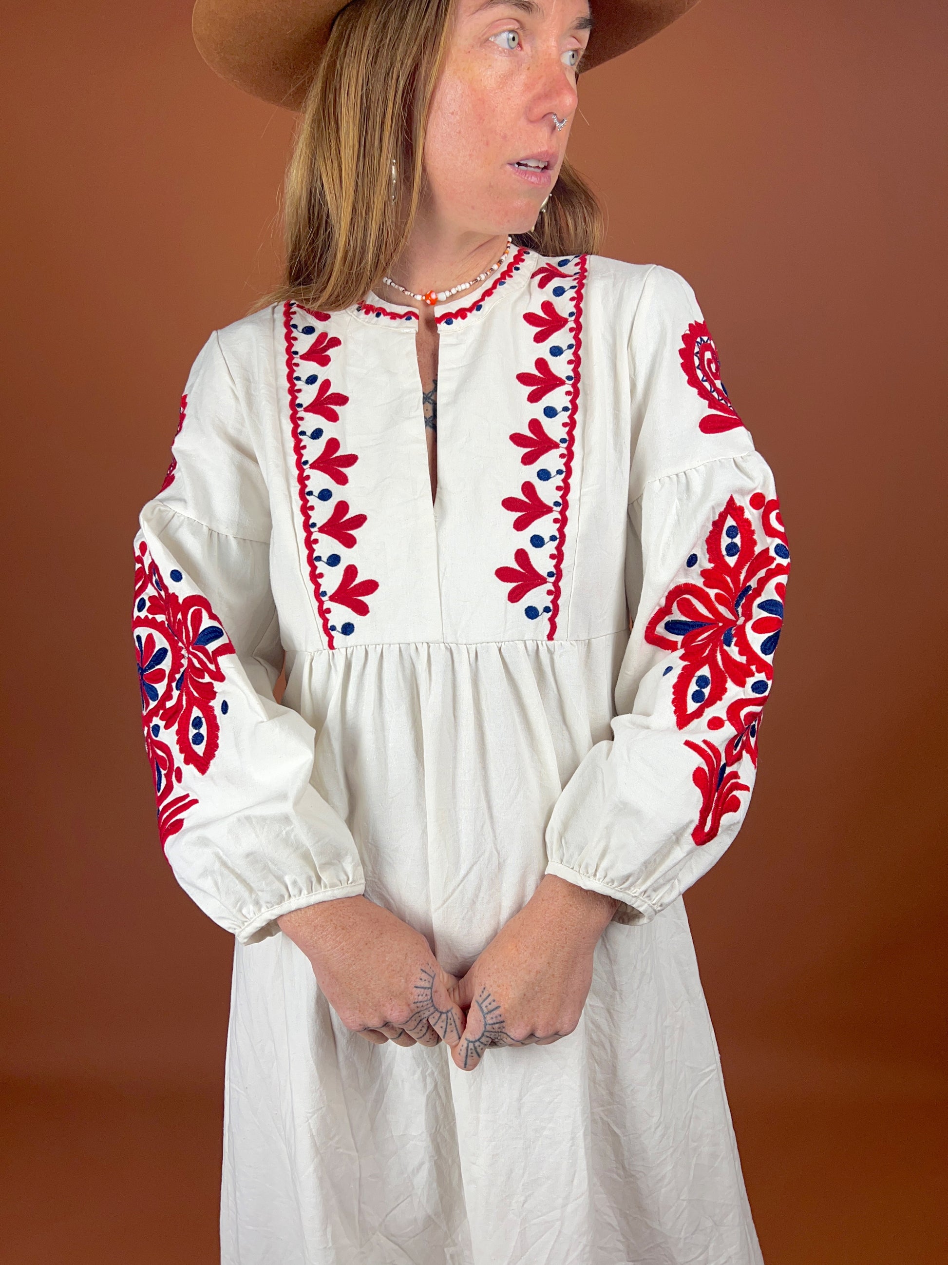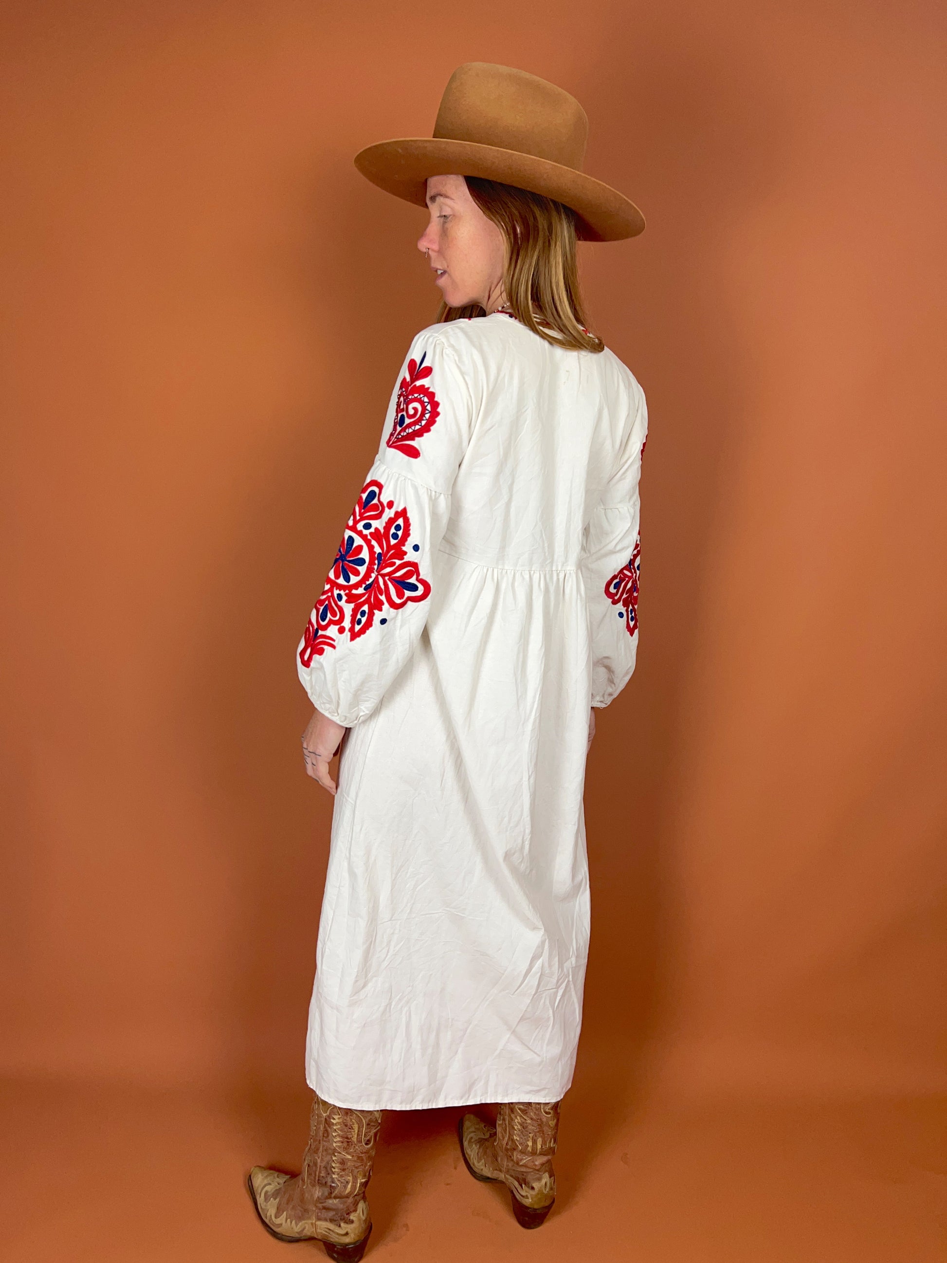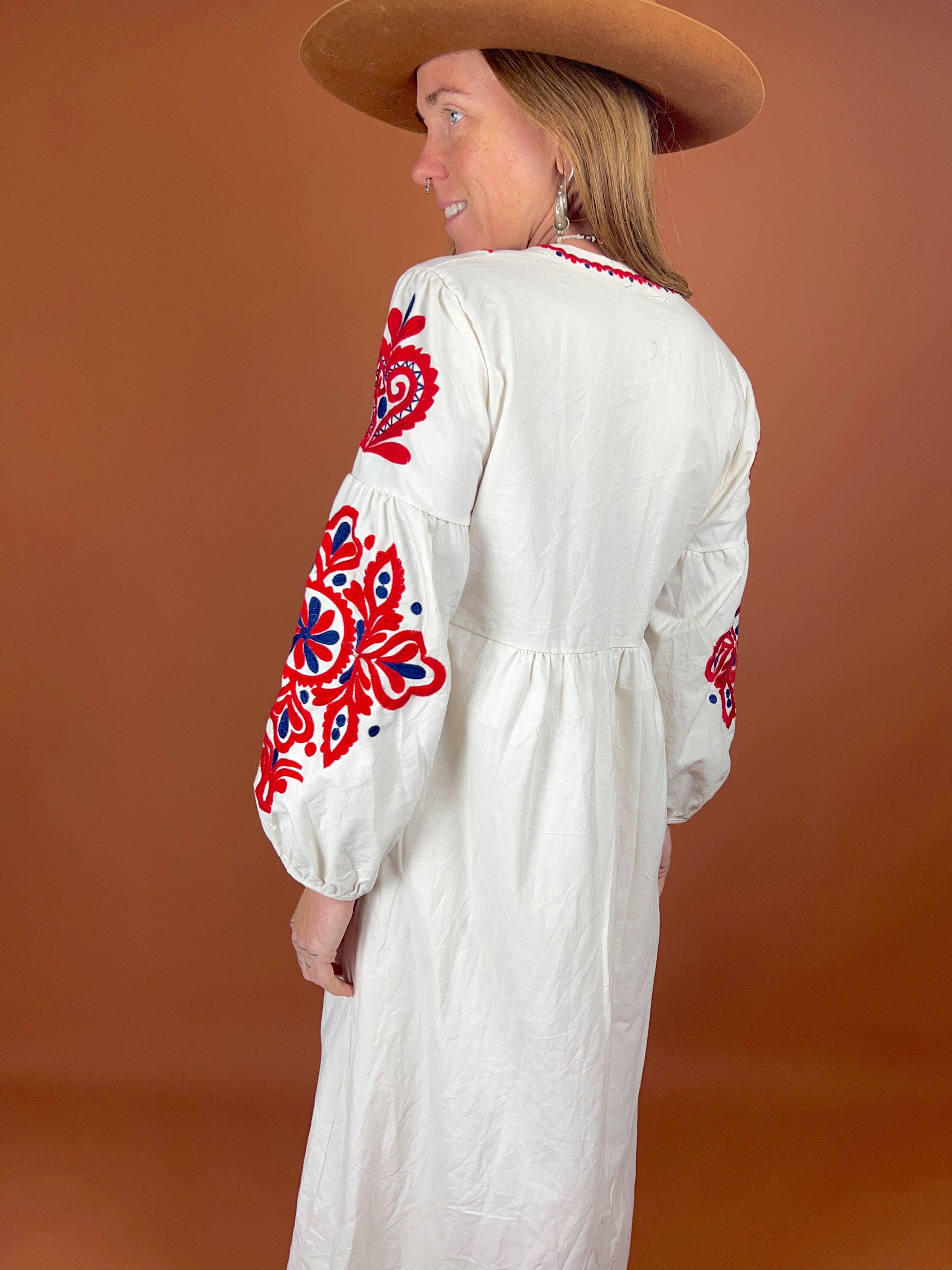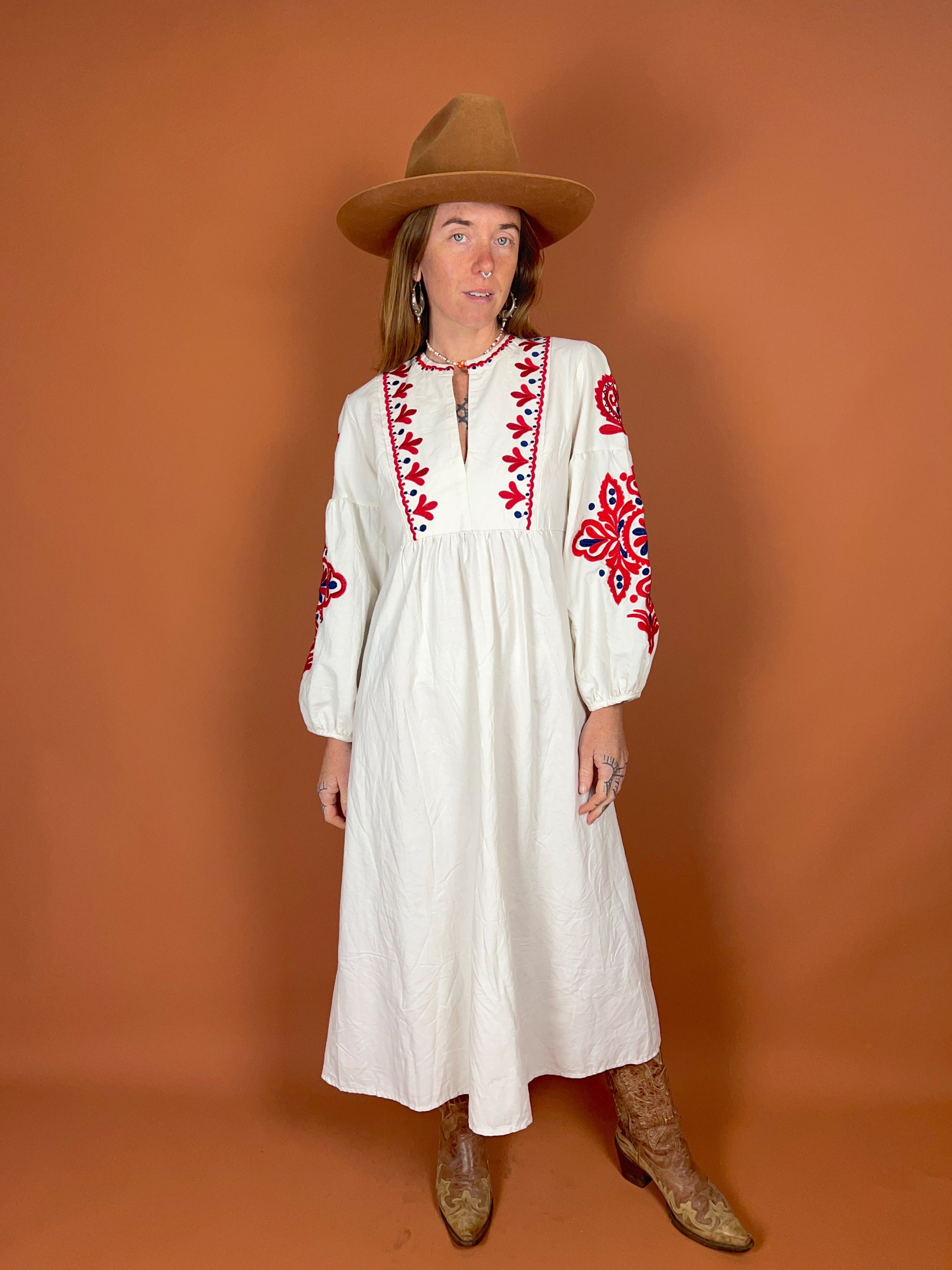 Discover the charm of the VTG 70's Heavy Cotton Linen Embroidered Maxi Dress, a true vintage gem that stands out in any wardrobe. This exquisite piece combines the durability of heavy cotton and linen with intricate embroidery, showcasing a unique craftsmanship that is hard to find today.