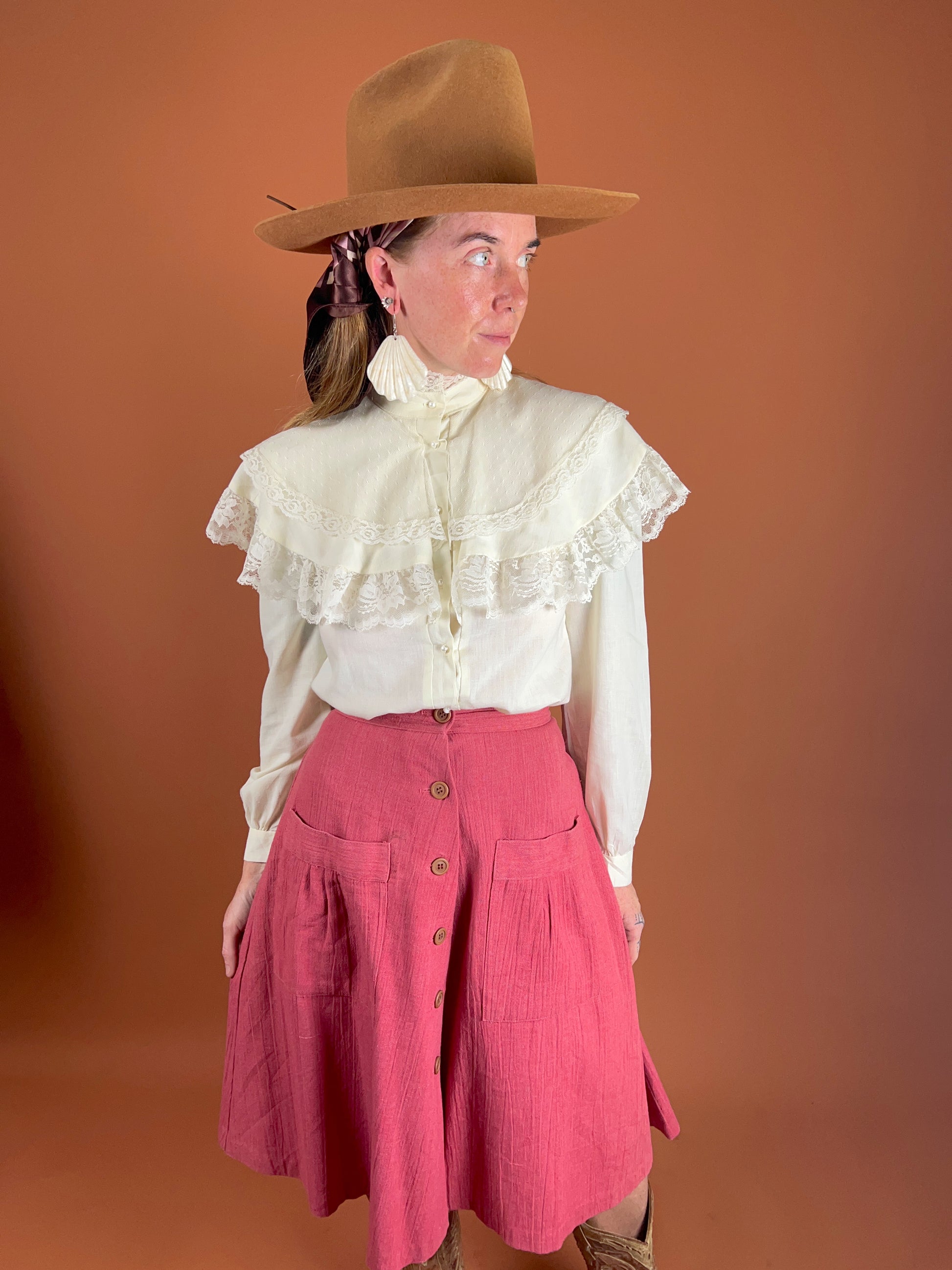 Channel effortless 60’s bohemian style with this vintage button-down skirt in size 6. Crafted for a flattering fit, its classic button-front design adds subtle detail while offering versatile wear. Light and breezy, it pairs beautifully with tucked-in tops or loose blouses for a relaxed, timeless look. Made in USA.