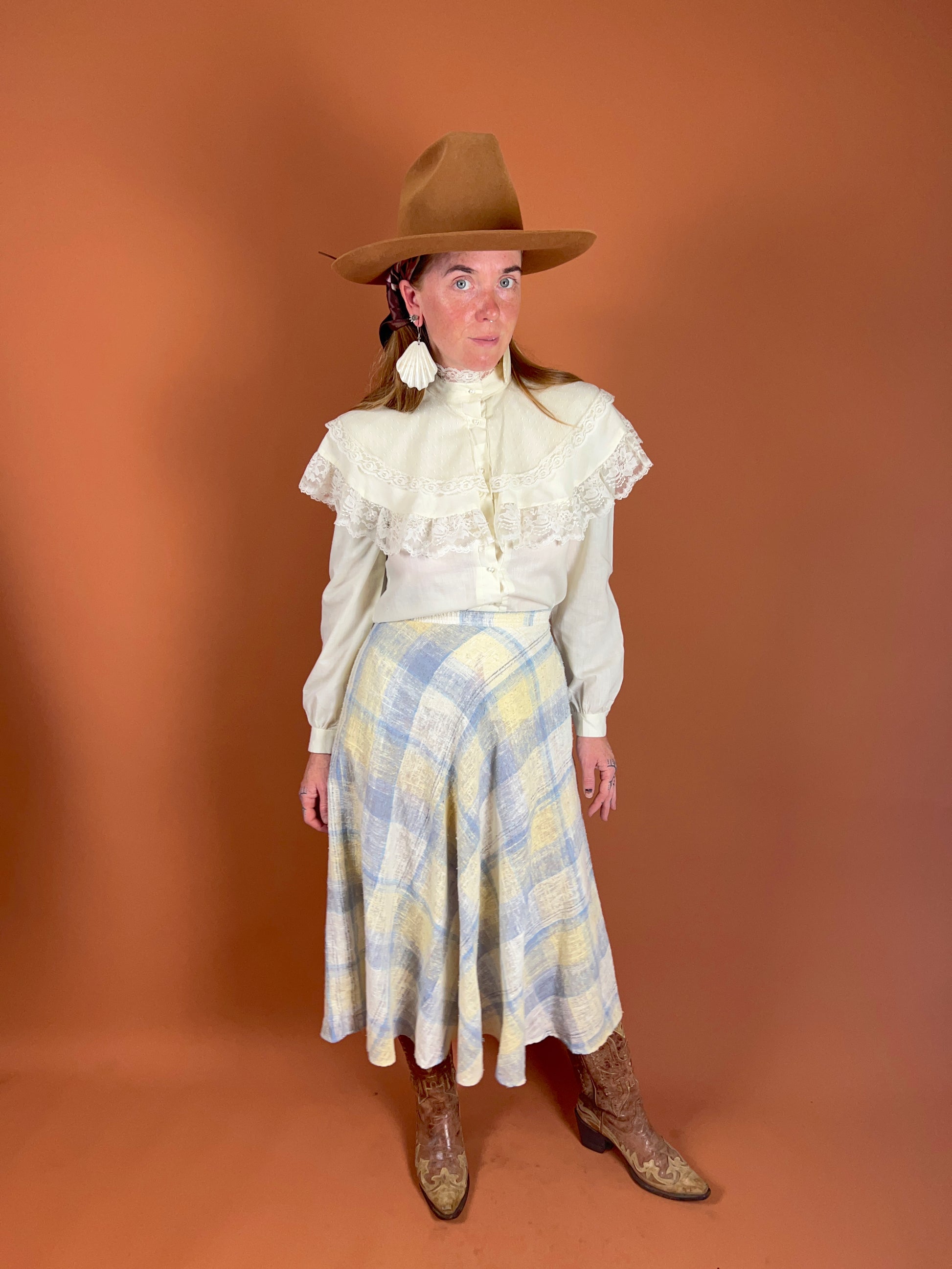 Add a touch of vintage bohemian charm with this 70’s plaid bias-cut skirt in size 12. The flowing silhouette enhances movement and comfort, while the classic plaid pattern brings a timeless, relaxed vibe. Perfect for pairing with layered tops or knitwear, this skirt effortlessly blends retro style with laid-back elegance. Feature two pockets. Elastic waist. Could be worn low rise on different sizes. Please check measurements. Made in USA.